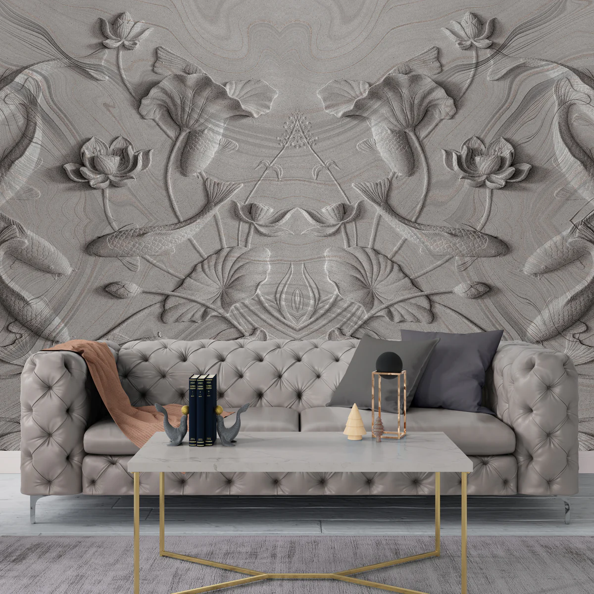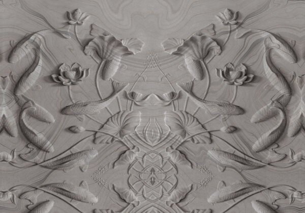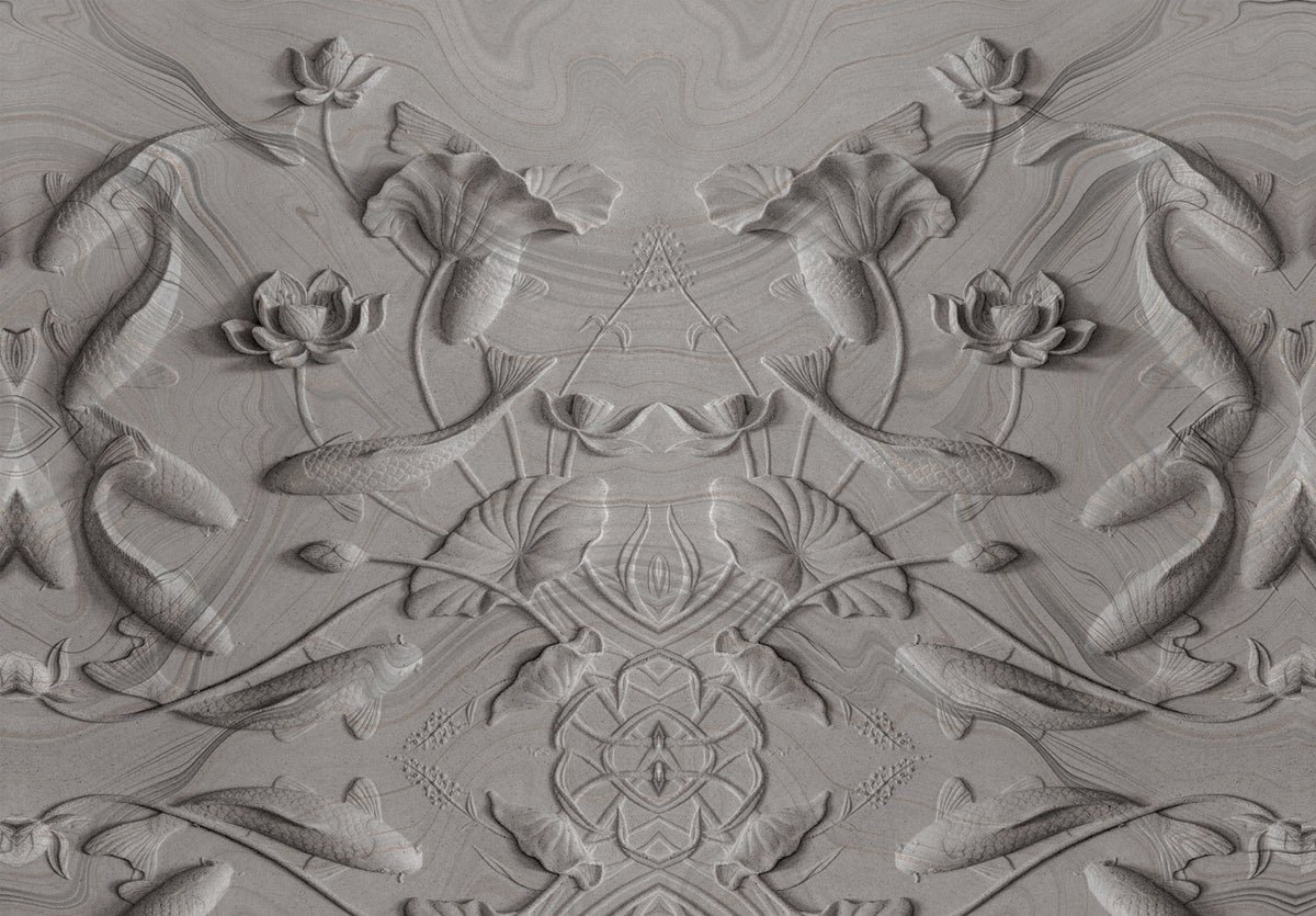 This wall mural features a stunning 3D carved stone style design with koi fish, lotus flowers, and flowing water patterns arranged in a symmetrical artistic layout. The grey stone texture gives the wall a sculpted and embossed look, creating a rich and premium interior effect. The koi fish and lotus symbolize peace, prosperity, and harmony, making this mural perfect for calm and elegant spaces.