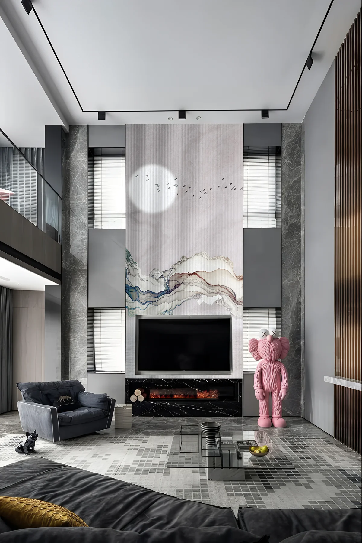 Its vertical composition enhances wall height and makes it ideal for statement areas such as TV backdrops or double-height walls. The neutral base ensures it complements a wide range of furniture styles and color palettes.
