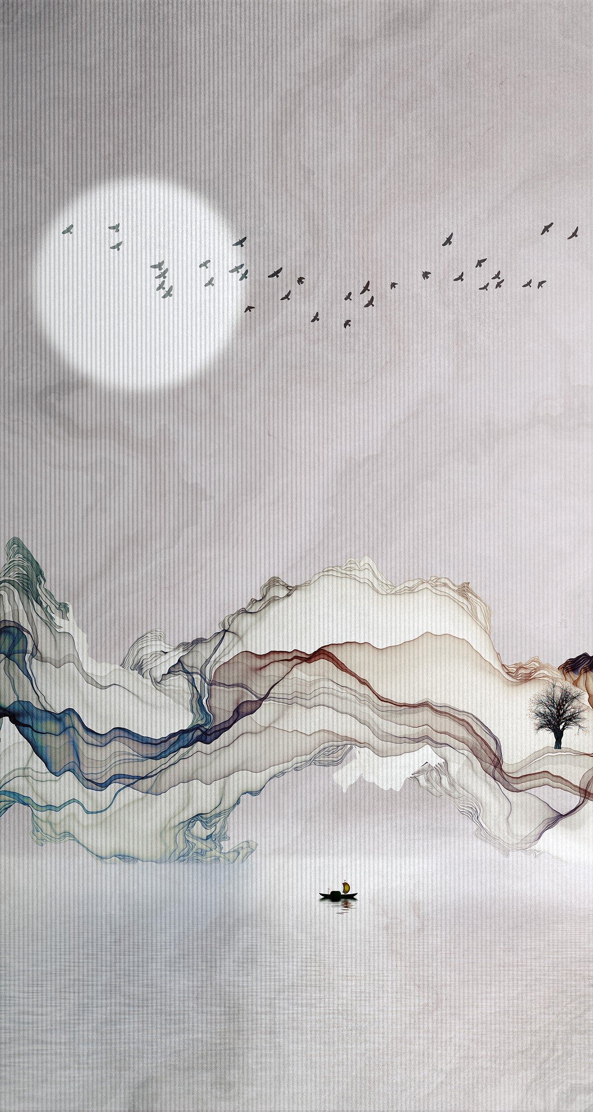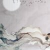 This design features fluid, layered mountain forms crafted with delicate flowing lines in subtle shades of blue, grey, and earthy tones. The soft glowing moon and flying birds above add a sense of openness and tranquility, while the small boat below introduces a peaceful focal point.