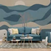 This wall mural features a modern abstract landscape design inspired by nature, with flowing wave shapes, a soft rising sun, and minimal tree silhouettes. The combination of blue, beige, and muted natural tones creates a calm and relaxing atmosphere, making it perfect for living rooms, bedrooms, lounges, and modern interiors. The smooth curves and layered shapes give the wall a soft artistic look without making the space feel heavy. The cool blue shades add freshness, while the warm beige tones keep the design balanced and elegant. Printed using high quality technology on premium wall covering materials, the mural offers sharp details, smooth texture, and long lasting durability. The mural is available in multiple material finishes and can be customized according to your wall size for a seamless and professional installation.