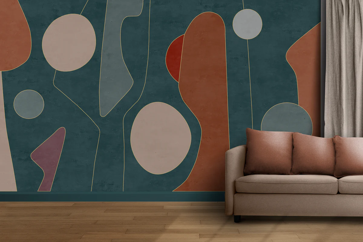 This wall mural features a modern abstract geometric design with artistic shapes, circles, and flowing lines in deep blue, beige, rust, and neutral tones. The combination of bold colors and soft curves creates a premium and designer look, making it perfect for modern homes, luxury interiors, studios, and feature walls. The balanced color palette gives the wall depth without making the space look heavy, while the artistic composition adds a unique and sophisticated touch. This mural works beautifully with wooden furniture, warm lighting, and contemporary décor styles. Printed using high quality technology on premium wall covering materials, the mural delivers sharp details, smooth texture, and long lasting durability. Available in multiple material finishes, the mural can be customized according to your wall size for a seamless and professional installation.