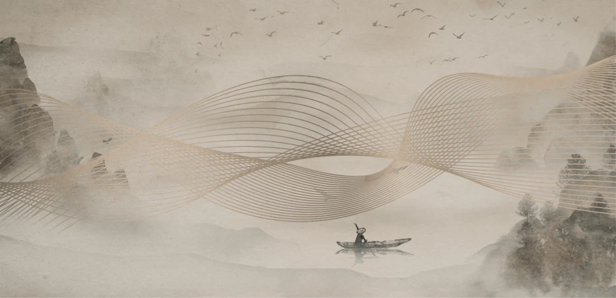 This stunning wall mural combines the beauty of a serene mountain landscape with flowing abstract wave lines, creating a unique fusion of nature and modern design. The calm scenery featuring misty mountains, flying birds, and a lone boat evokes peace and tranquility, while the elegant wave patterns add a contemporary artistic touch.