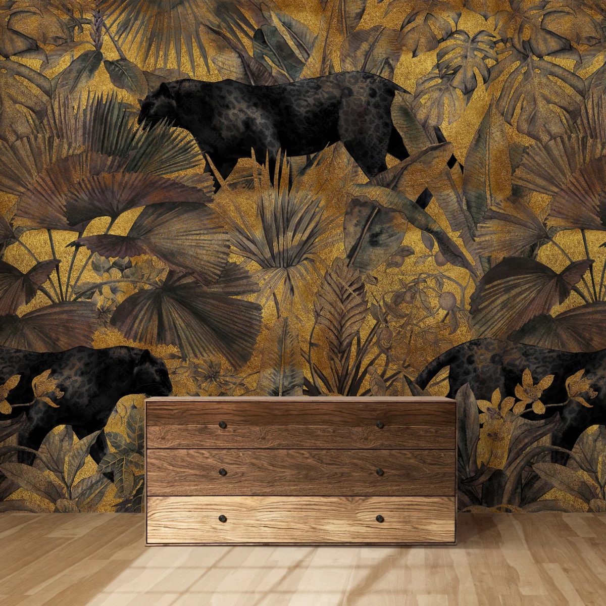 The contrast of deep black tones with warm gold textures gives a royal and modern feel, making it an ideal centerpiece for feature walls. The intricate detailing of leaves and panthers adds depth, while the overall composition delivers a high-fashion, designer look.