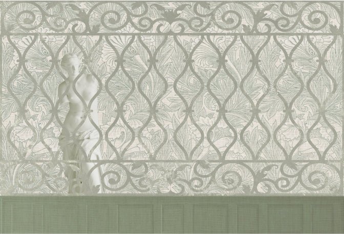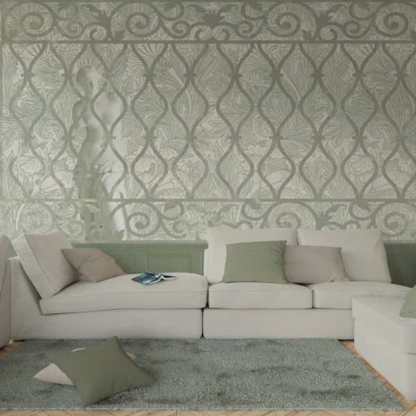 This wall mural features a stylish vintage fence pattern combined with soft floral texture in the background, creating a refined and elegant wall design. The muted green and grey tones give the mural a calm, sophisticated, and premium look that blends perfectly with modern as well as classic interiors. The layered pattern effect adds depth to the wall and makes the space feel more decorative without using bright colors.