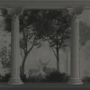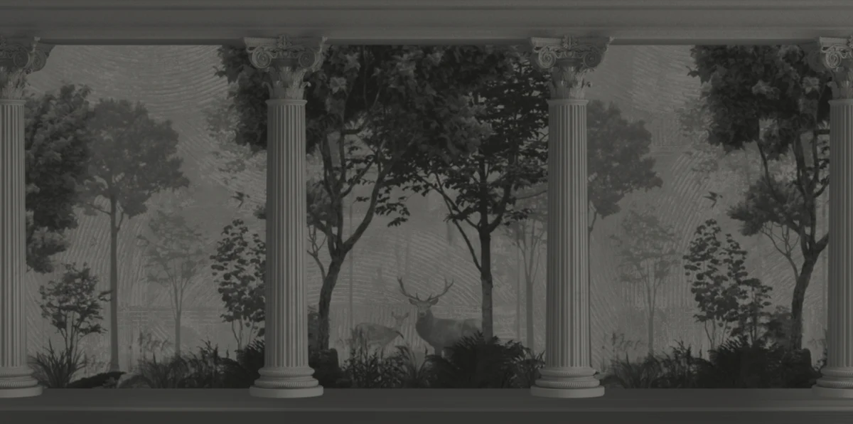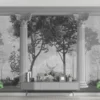 An elegant black and white mural featuring Roman pillars and forest landscape, perfect for luxury and classic interiors.