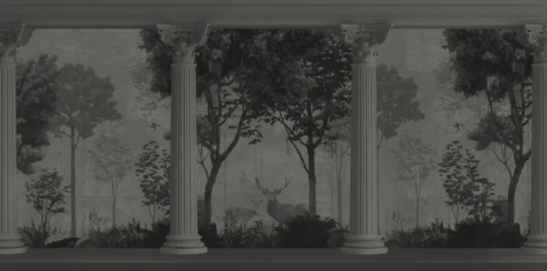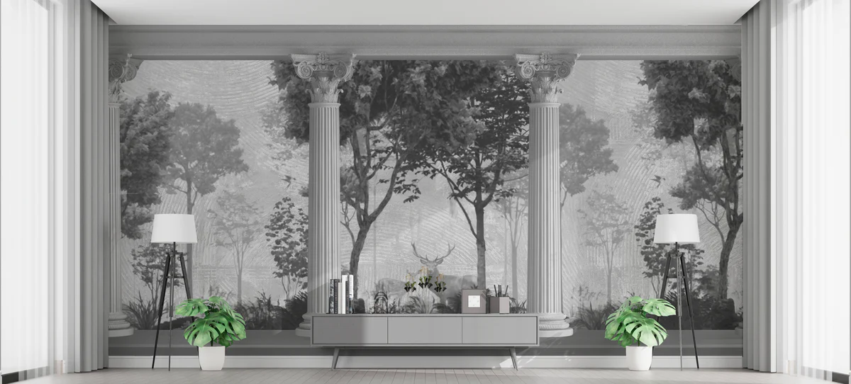 This wall mural showcases a beautiful classical Roman style design featuring tall decorative pillars with a peaceful forest landscape in the background. The artwork gives the illusion of an open palace garden with trees, deer, and nature scenery, creating a calm and royal atmosphere. The monochrome black and grey tones add a vintage and premium look, making the mural perfect for elegant interiors. The design brings depth to the wall and makes the space look bigger, brighter, and more luxurious. Ideal for living rooms, bedrooms, hotel interiors, offices, and designer spaces, this mural gives a timeless architectural feel inspired by Roman and European palace art. Printed using high quality technology on premium wall covering materials, the mural provides sharp detailing, smooth finish, and long lasting durability. The size can be customized according to your wall dimensions for a perfect fit.