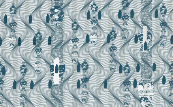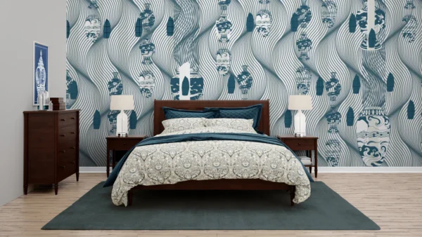 This wall mural features a unique artistic design with decorative vintage vases combined with flowing wavy line patterns that create a beautiful sense of movement on the wall. The mural is designed in elegant blue and white tones, giving a calm, sophisticated, and stylish look. The curved line pattern adds depth and texture, while the classic vase illustrations bring an artistic and traditional touch, making the mural perfect for modern-classic interior themes.