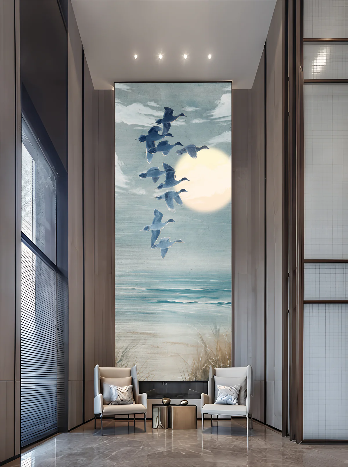 Its tall vertical format enhances height and creates a dramatic focal point, especially in modern double-height spaces, entryways, or luxury living rooms.