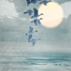 A flock of graceful birds glides across a soft sky, illuminated by a glowing sun that adds warmth and depth to the composition. Below, gentle ocean waves meet the shore, creating a soothing balance between sky and sea.
