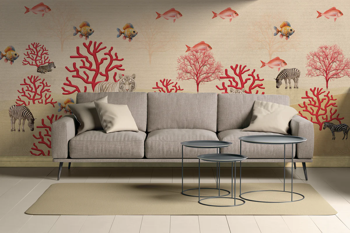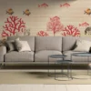 The bold red coral elements contrast beautifully with the soft neutral background, giving the mural a luxury designer appeal with a creative twist. It’s perfect for interiors that want to stand out and express personality.