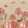 The Coral Safari Fusion mural is a striking blend of land and ocean worlds, combining majestic animals like tigers and zebras with vibrant coral forms and floating fish. This surreal composition creates a dreamlike, artistic environment that instantly grabs attention.