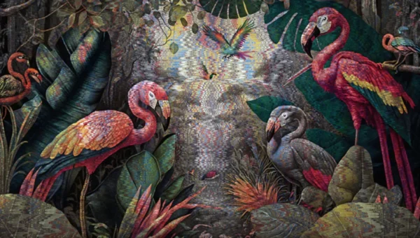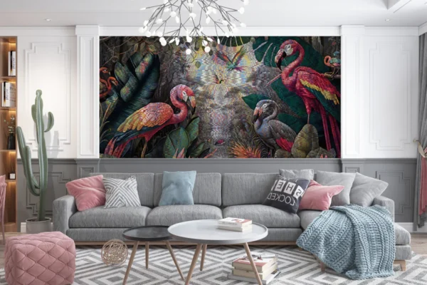The Enchanted Flamingo Forest mural is a masterpiece of color, texture, and imagination, bringing together exotic flamingos, tropical foliage, and a dreamy reflective landscape.
