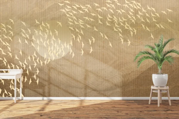 This artistic wall mural showcases a graceful composition of flying birds moving across a warm textured landscape, creating a sense of freedom, motion, and calmness. The soft beige and earthy tones bring warmth to the space, while the flowing pattern adds depth without making the wall look heavy. Inspired by nature and contemporary decorative art, this mural is designed to create a peaceful and elegant environment suitable for both modern and classic interiors. The balanced colors make it perfect for living rooms, bedrooms, lounges, offices, and luxury interior spaces. The mural is printed using high-quality technology on premium wall covering materials. You can choose from different material finishes, each providing a unique texture and visual effect while maintaining excellent durability and color richness. Each wall mural is custom made according to your wall dimensions to ensure a seamless and professional result.