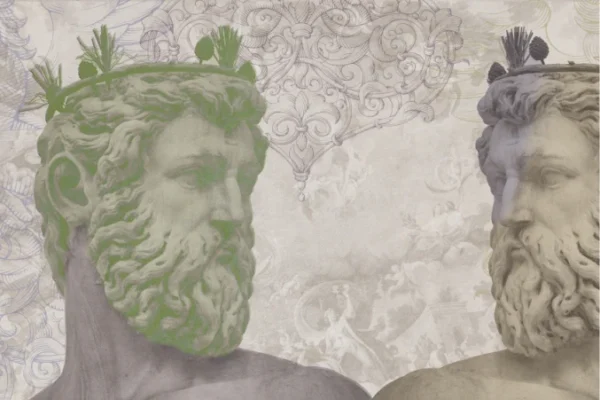 The sculptural faces are rendered with refined detail, accented by subtle botanical crown elements that symbolize wisdom, strength, and legacy. A softly layered background of ornamental sketches, aged textures, and muted stone tones adds depth and visual intrigue without overwhelming the space.