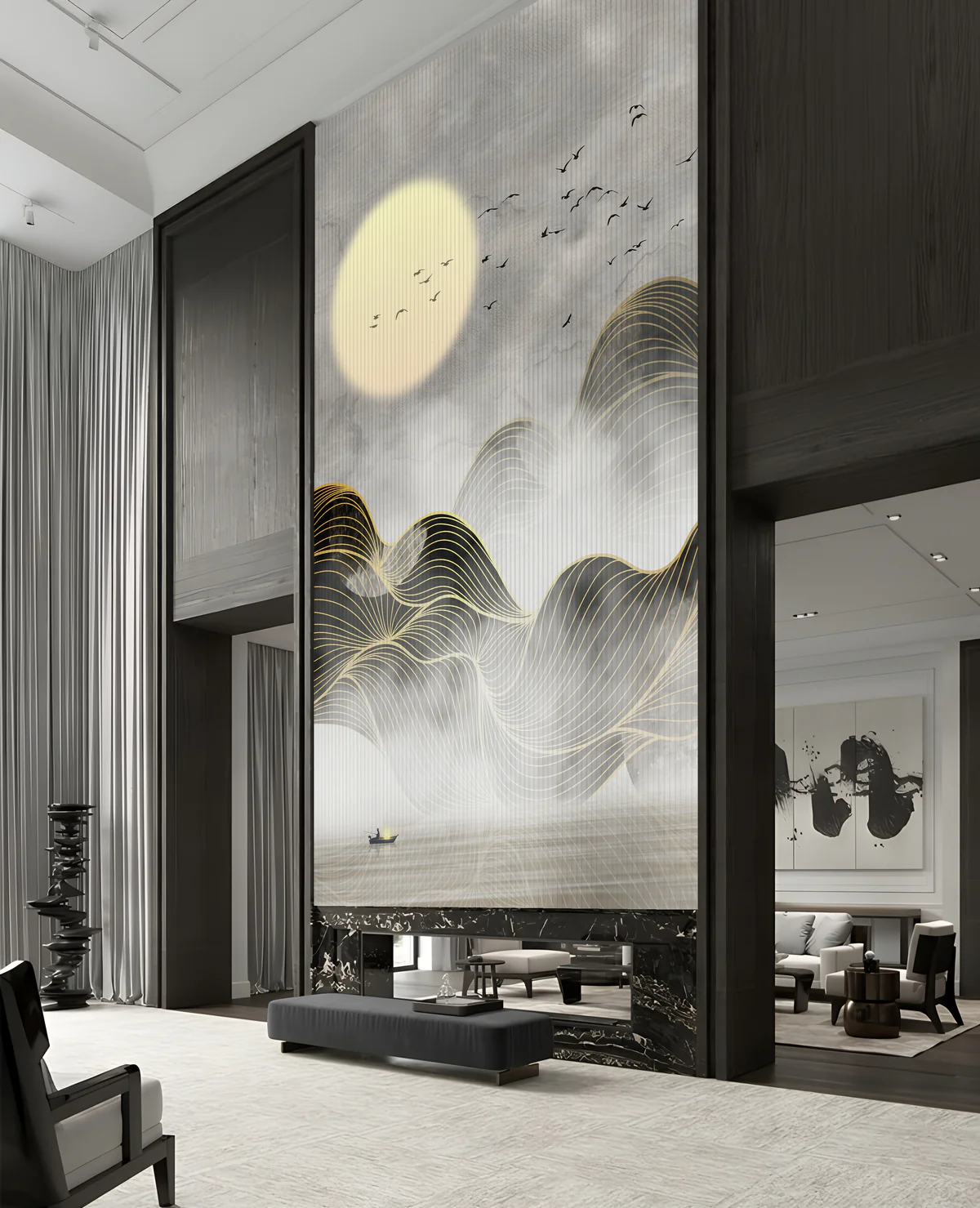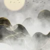 This mural features smooth, flowing mountain forms highlighted with elegant gold line detailing, creating a sense of movement and depth. The soft misty background, paired with a glowing sun and flying birds, adds calmness and visual balance to the design. A small boat at the bottom enhances the storytelling element, symbolizing peace and solitude.