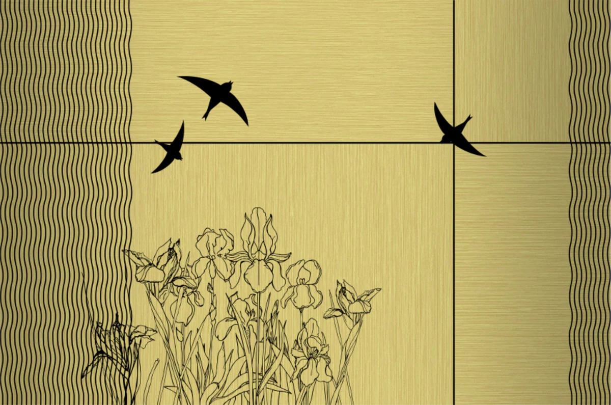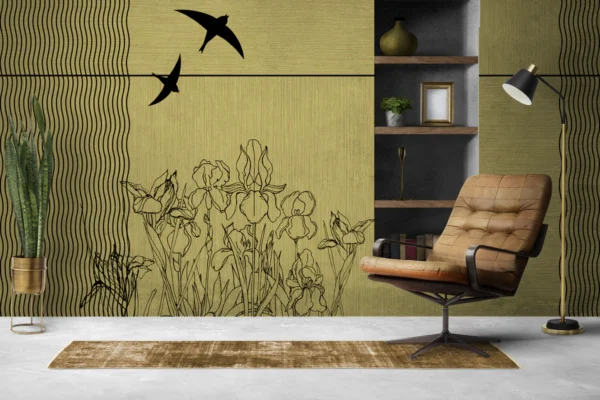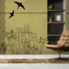 The soft floral drawing and bird silhouettes bring a calm and peaceful atmosphere, while the golden tone adds warmth and elegance to the space. This mural is ideal for feature walls where you want a luxury, minimal, and designer appearance without using heavy colors. The balanced design makes it suitable for both modern furniture and classic décor styles.