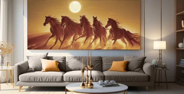 The golden-orange palette adds a premium and cozy feel, making any room look instantly more expensive and inviting. The sunlight reflecting on the horses enhances depth and realism, while the motion adds energy and life to the wall.