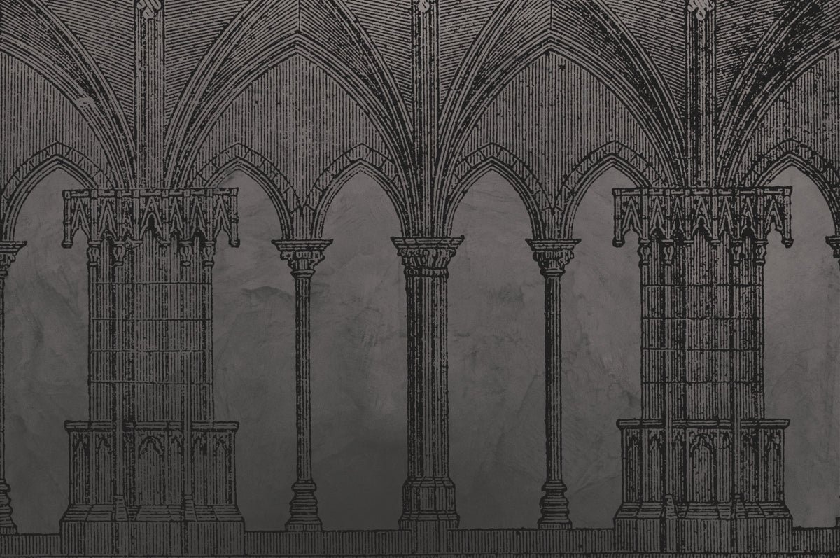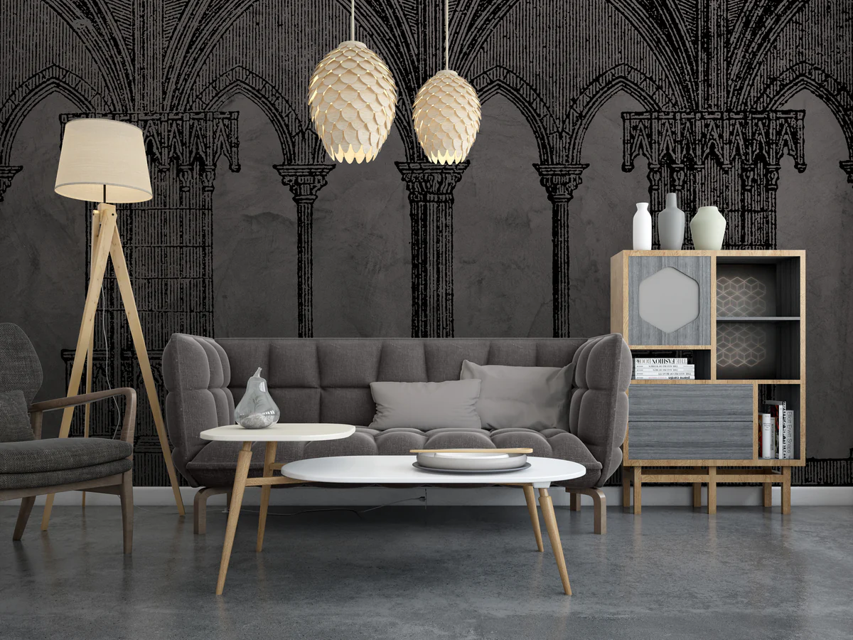 This wall mural features a stunning gothic architectural design inspired by vintage European buildings and cathedral arches. The mural showcases detailed arch structures, columns, and classic stone textures that create a grand and royal atmosphere on the wall. The dark grey and black tones give the mural a bold, elegant, and sophisticated look, making it perfect for premium interior spaces.