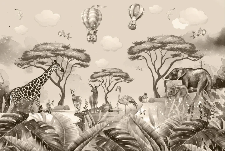 The Jungle Safari Kids Wall Mural blends playfulness with elegance, creating a peaceful yet imaginative environment for children. Featuring beautifully illustrated animals like giraffes, elephants, deer, and flamingos, this design is enhanced with hot air balloons and soft forest elements, giving it a magical storytelling vibe.