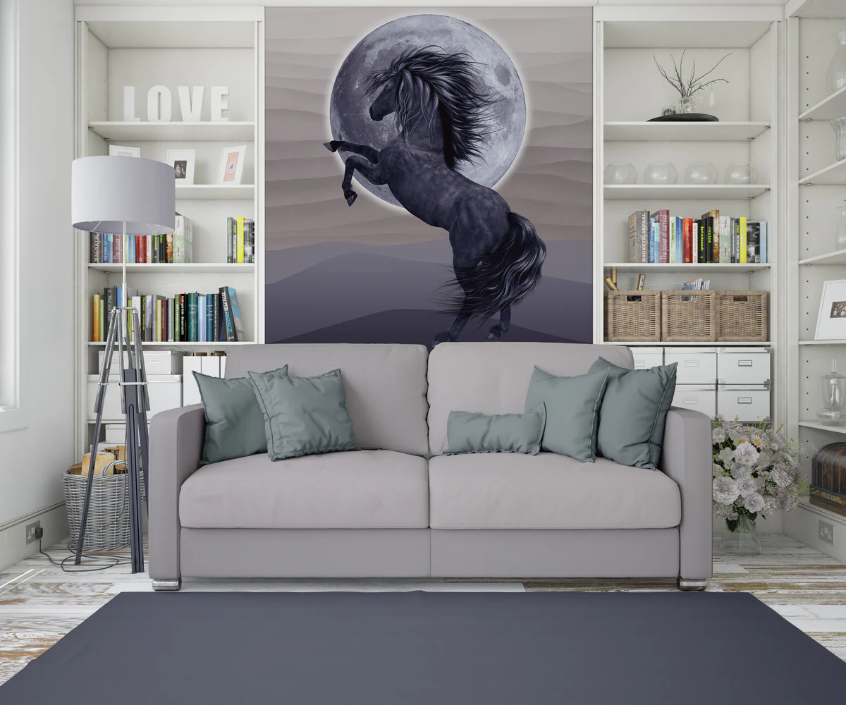 The monochrome grey palette with subtle gradients adds depth and sophistication, while the flowing mane and powerful stance of the horse bring energy and movement into the room. The moonlight effect enhances the overall ambiance, giving your interior a cinematic and premium feel.