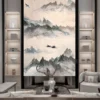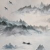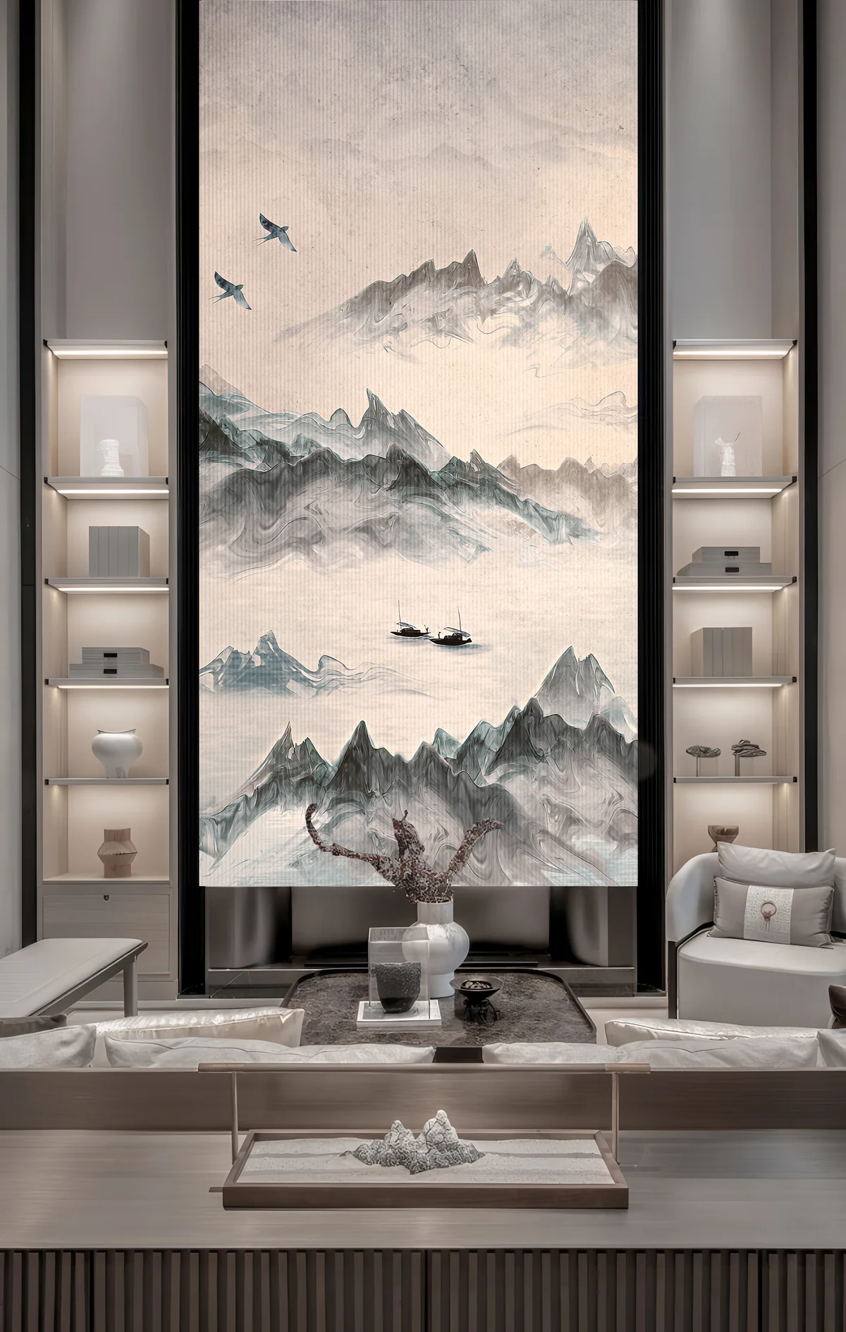 Inspired by traditional ink-style landscapes, this design features layered mountains fading into soft mist, creating a sense of depth and infinite space. The calm water below reflects subtle movement, while small boats and birds introduce a gentle narrative of quiet life and journey.