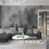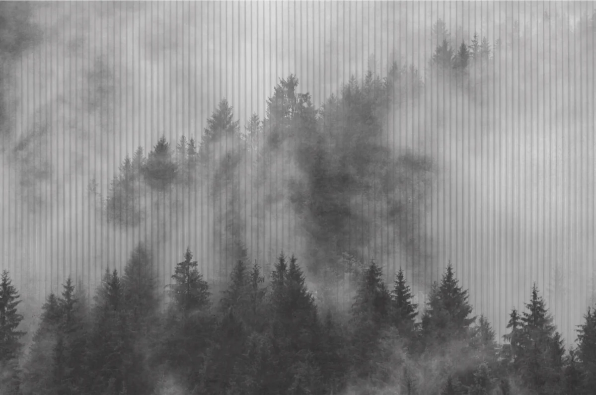 A calm monochrome forest mural with misty pine trees, perfect for modern, minimal, and Scandinavian-style interiors.