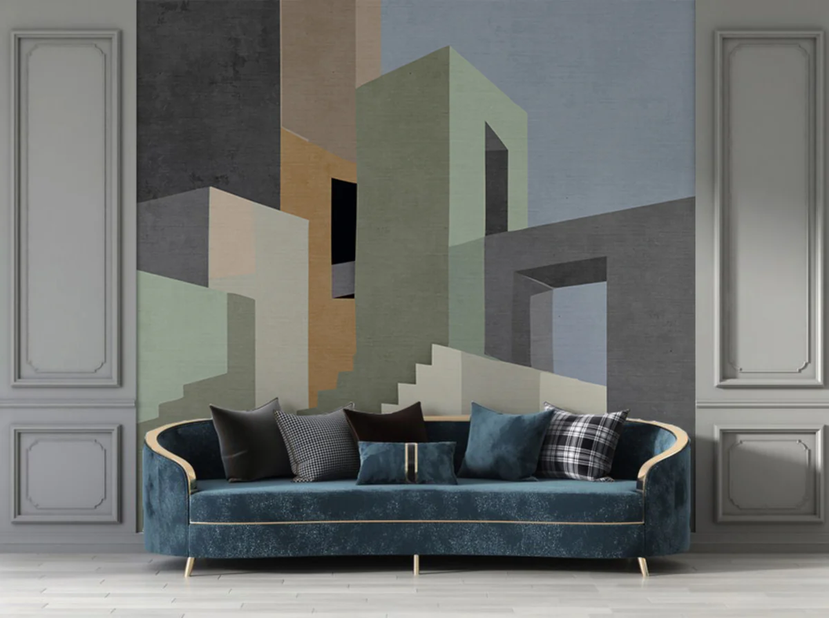This wall mural features a modern architectural abstract design inspired by geometric buildings, stairs, and structural forms. The combination of soft green, beige, grey, and muted tones creates a calm and sophisticated atmosphere, making the mural perfect for modern homes and designer interiors. The structured shapes and depth effect give the wall a premium artistic look, similar to architectural artwork. This design works beautifully in living rooms, offices, bedrooms, studios, and luxury spaces where a clean and stylish wall statement is needed. Printed using high quality technology on premium wall covering materials, the mural offers sharp details, smooth finish, and long lasting durability. Available in multiple material options, the mural can be customized according to your wall size for a perfect seamless installation.