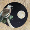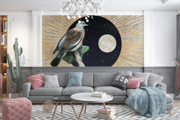 This wall mural features a stunning artistic design showing a detailed bird sitting on a branch with a full moon in the background, surrounded by golden sun rays and a starry night sky. The combination of celestial elements and vintage illustration style creates a unique luxury wall art effect that makes the space look rich, creative, and eye-catching.