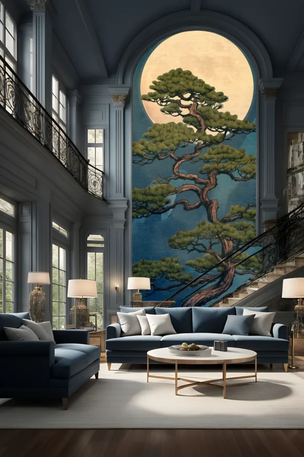 The Moonlight Pine Tree Wall Mural is a timeless blend of nature, elegance, and oriental-inspired design.