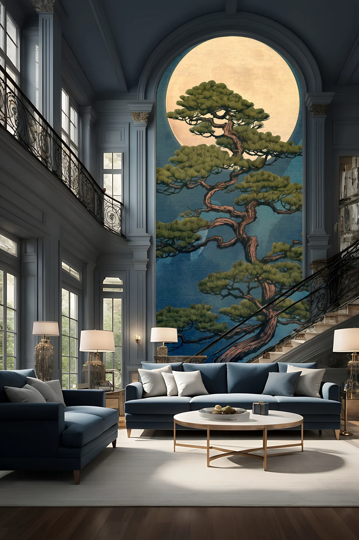 The contrast between the warm moonlight and cool blue tones gives the mural a luxurious yet peaceful feel. Inspired by traditional Asian landscapes, this design brings a meditative and refined atmosphere into any interior space.