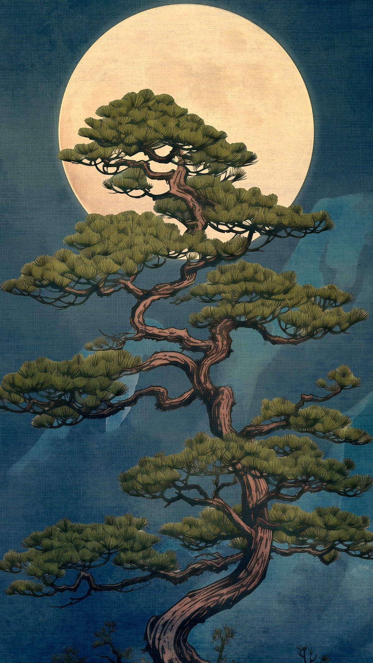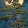 This artwork highlights a beautifully shaped pine tree set against a deep blue backdrop, illuminated by a large glowing full moon. The detailed branches and layered foliage create a sense of balance and harmony, while the soft gradients in the background add depth and tranquility.