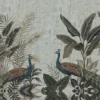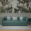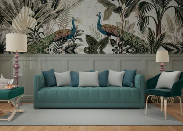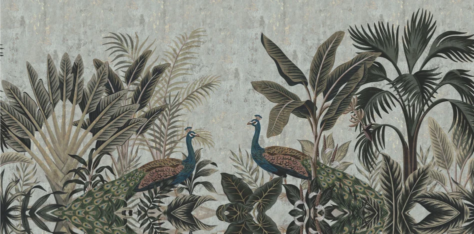 This wall mural features a beautiful tropical jungle design with elegant peacocks surrounded by detailed leaves and natural elements. The soft neutral background combined with green, grey, and earthy tones creates a calm and stylish atmosphere, making the wall look rich and decorative without being too dark. The fine detailing in the feathers, plants, and textures gives the mural a premium artistic appearance suitable for modern and classic interiors.