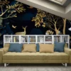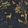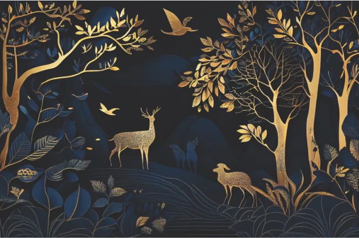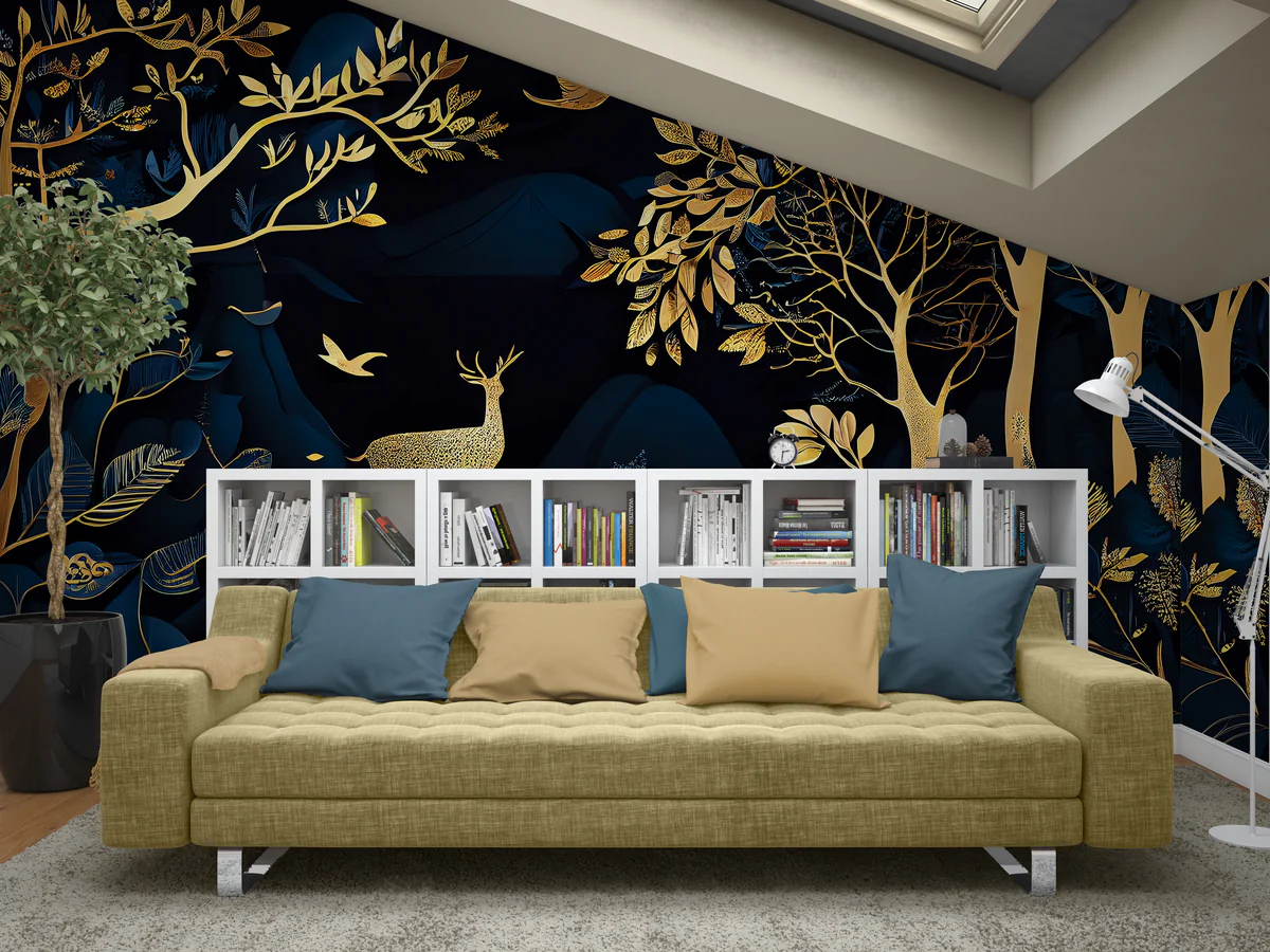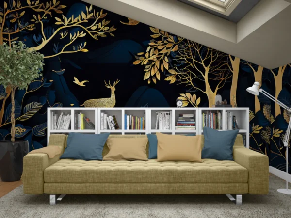 This wall mural showcases a breathtaking royal forest scene with golden trees, deer, and birds set against a deep navy blue background. The rich contrast between the dark base and shimmering gold artwork creates a bold, luxurious, and high-end visual appeal. The intricate detailing of the trees and wildlife adds an artistic and designer touch, making the mural a perfect centerpiece for modern interiors.