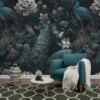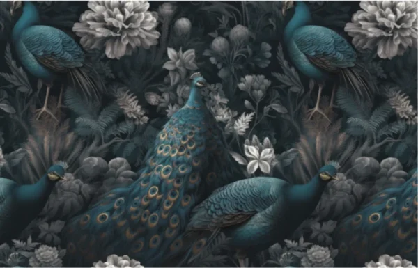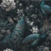 This wall mural features a rich and luxurious design with beautiful peacocks surrounded by detailed floral artwork. The deep dark background combined with teal, grey, and soft metallic tones creates a royal and elegant atmosphere. The fine detailing in the feathers and flowers gives the mural a realistic and artistic look, making the wall feel premium and decorative.