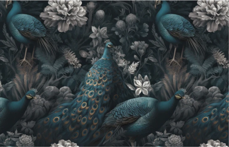 The peacock design symbolizes beauty, luxury, and elegance, making this mural perfect for feature walls where a bold and sophisticated appearance is required. The dark color palette adds depth to the space while the floral elements keep the design soft and stylish. This mural works beautifully in modern, classic, and luxury interiors.