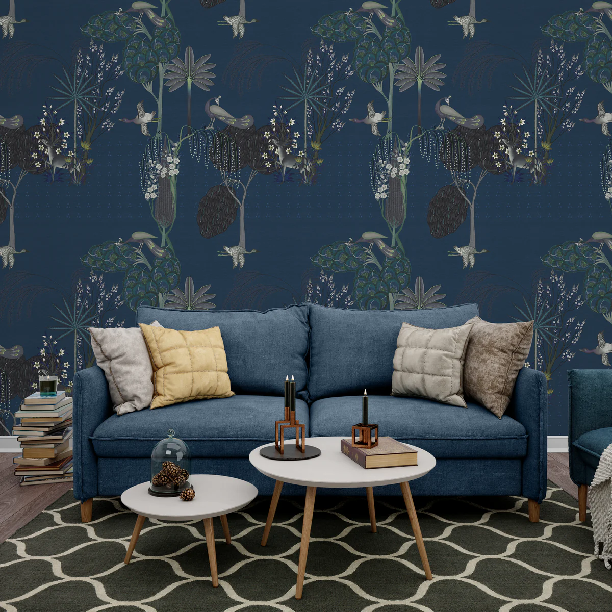 This wall mural features a beautiful royal garden design with peacocks, birds, trees, and decorative plants arranged in an artistic pattern on a deep blue background. The design gives a rich and elegant look inspired by vintage nature illustrations and luxury wallpaper styles. The detailed birds, floral elements, and garden patterns create a calm, artistic, and premium wall effect that makes the space look stylish and sophisticated.