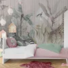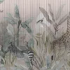The Safari Dream Kids Wall Mural is designed to create a peaceful, playful, and imaginative environment for children. Featuring gentle illustrations of a giraffe and zebra surrounded by soft tropical leaves and birds, this wallpaper blends nature with a soothing pastel palette.