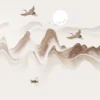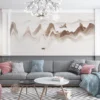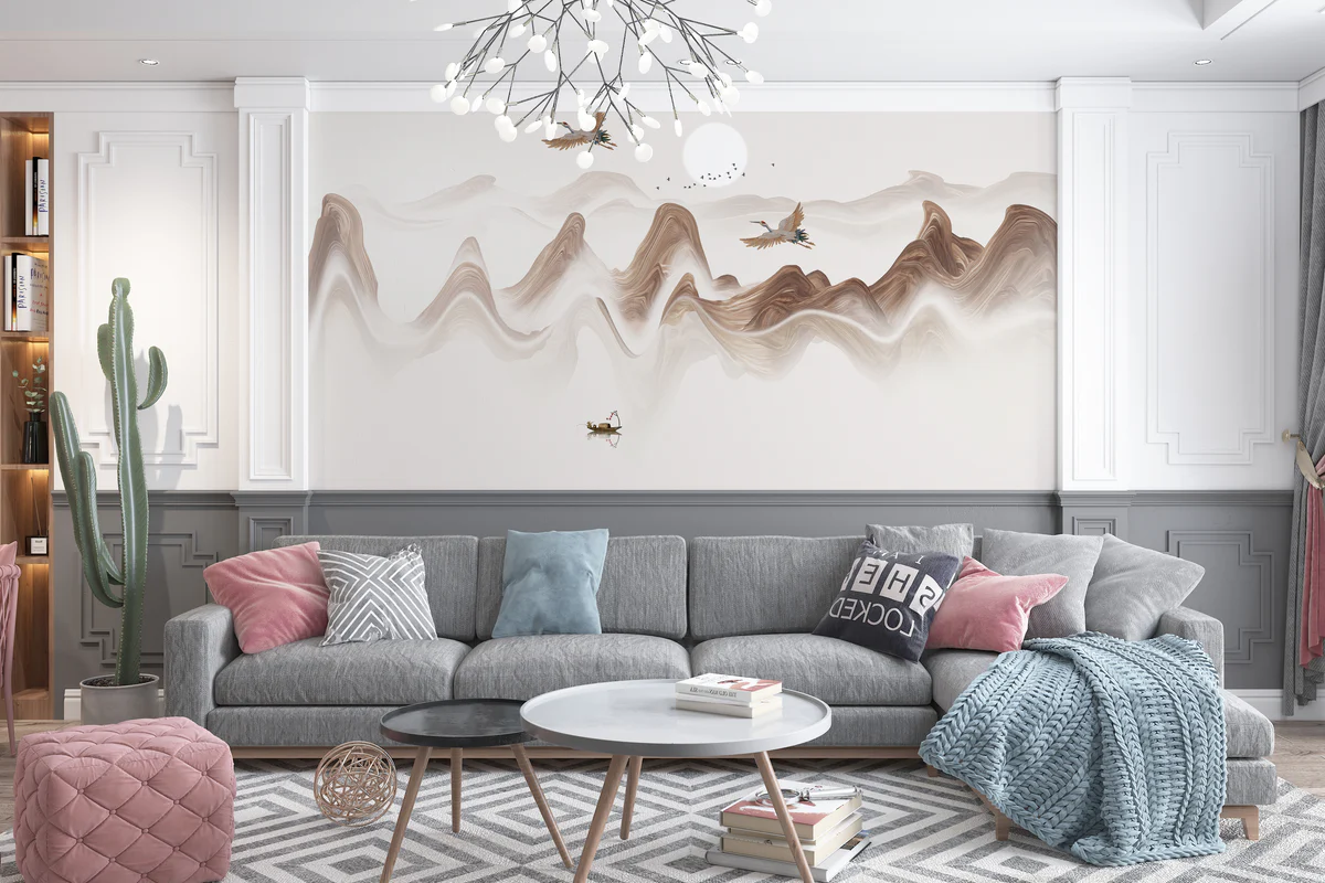 The Serenity Peaks mural blends modern abstraction with nature-inspired calmness. Flowing mountain forms in warm beige and brown tones create a smooth, wave-like landscape, while delicate birds and a soft sun element add life and balance.