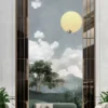 A peaceful sky and hillside mural featuring soft clouds, a glowing sun, and flying birds—perfect to create a calm and elegant atmosphere.