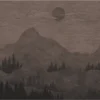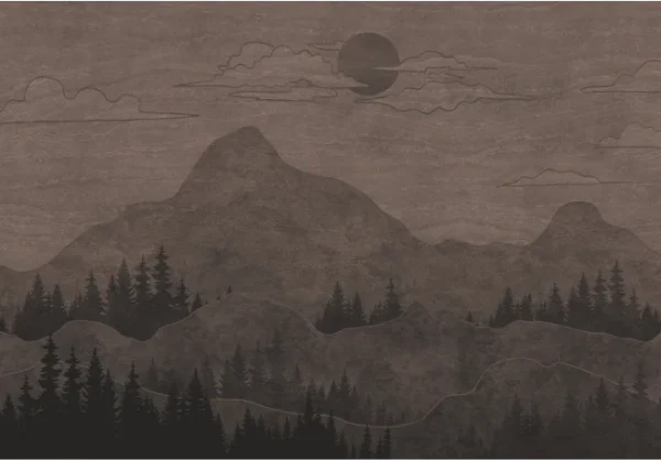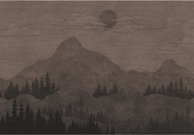 This elegant wall mural showcases a serene mountain landscape set in a deep, moody color palette. The design features softly layered mountains, dense forest silhouettes, and a subtle moonlit sky, creating a peaceful nighttime atmosphere.
