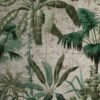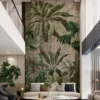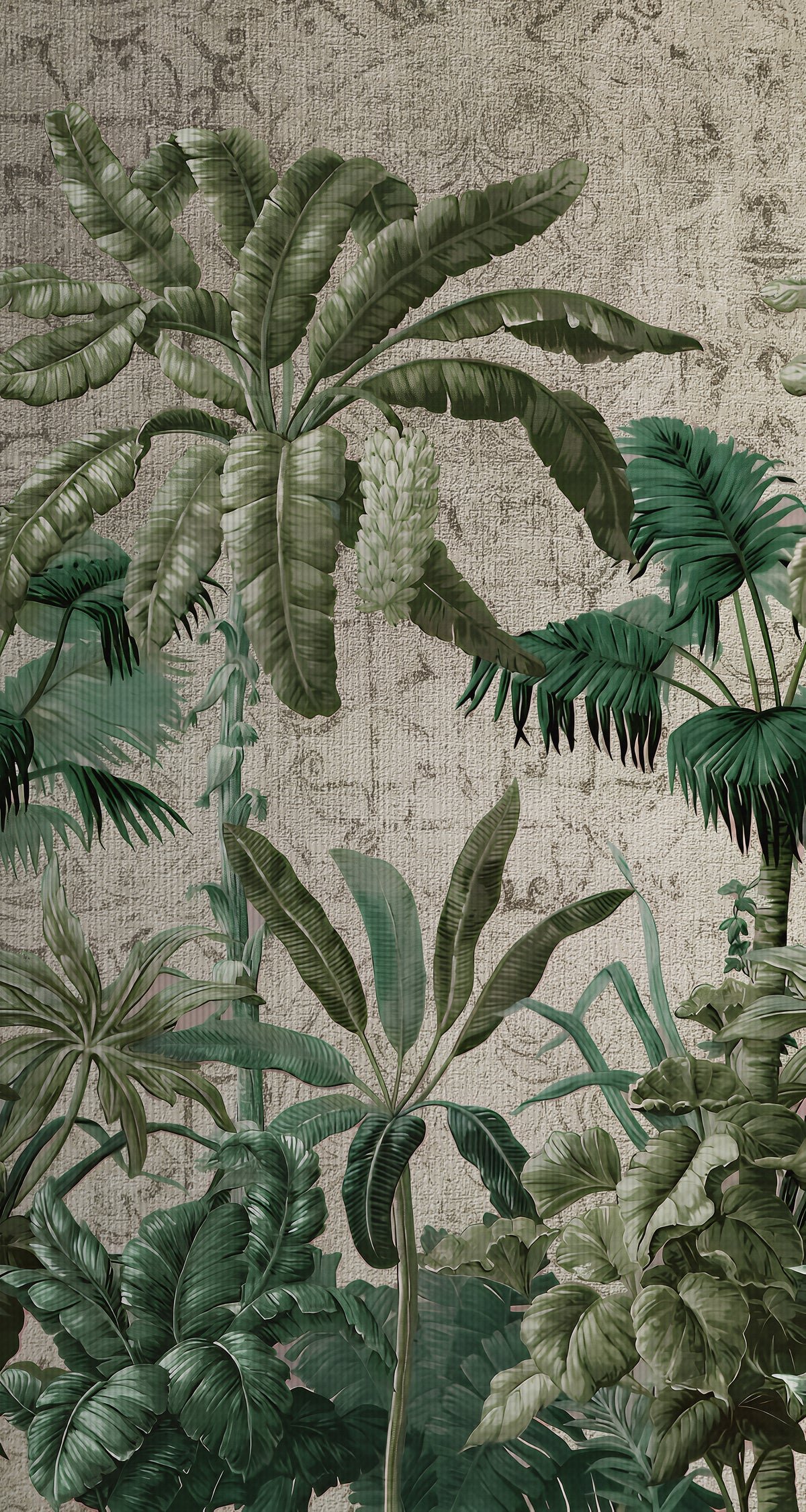 Featuring oversized banana leaves, palm foliage, and layered tropical elements, this mural brings a rich, immersive jungle feel while still maintaining a sophisticated and modern tone. The neutral textured base adds depth and gives the artwork a luxury, slightly vintage finish, making it suitable for high-end interiors.