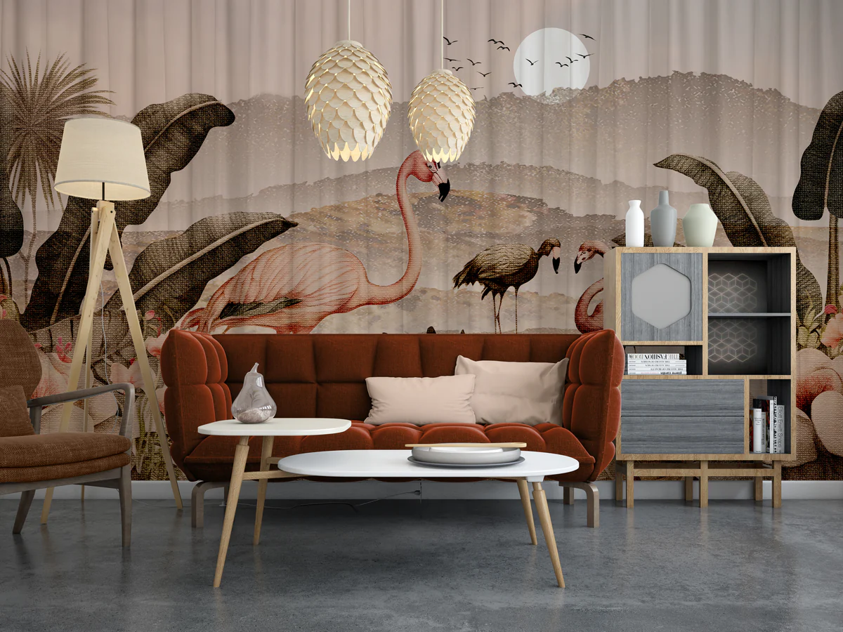 The muted beige, blush pink, and earthy tones give it a warm, sophisticated feel, while the artistic detailing adds depth and texture. The flamingos symbolize beauty and balance, making this mural not just decorative but also emotionally appealing.