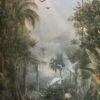 This design features dense tropical foliage, elegant palm trees, and a calm water body adorned with lotus flowers. Graceful birds in flight and a majestic crane add life and movement, while the misty background creates depth and a soothing atmosphere.