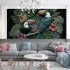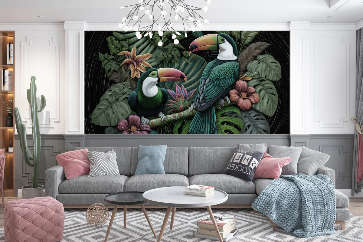 This wall mural features a stunning tropical design with colorful toucan birds surrounded by lush jungle leaves and exotic flowers. The deep dark background enhances the rich green tones and vibrant details, creating a bold and luxurious wall statement. The artistic composition gives a premium 3D effect, making the wall look more alive and decorative.