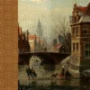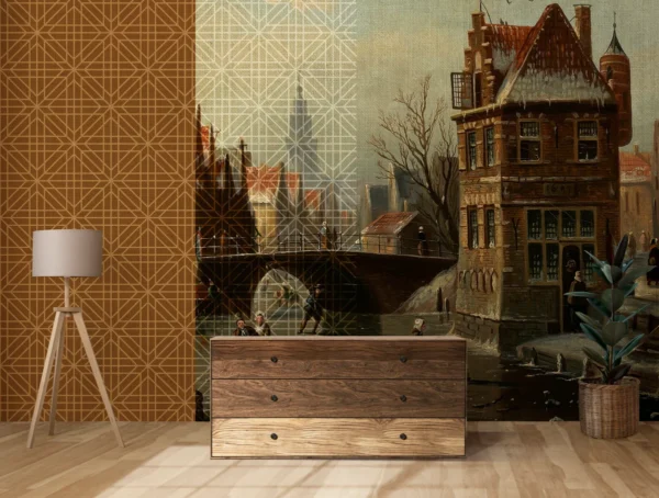 This wall mural features a beautiful fusion of modern geometric design and classic vintage cityscape artwork, creating a bold and artistic feature wall. The mural is designed with vertical sections, where one side shows an elegant geometric pattern in warm brown and beige tones, while the other side displays a detailed vintage European street painting with buildings, bridge, and people. The combination of modern lines and traditional art gives the wall a rich, sophisticated, and designer look.
