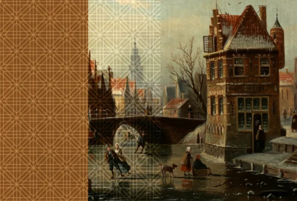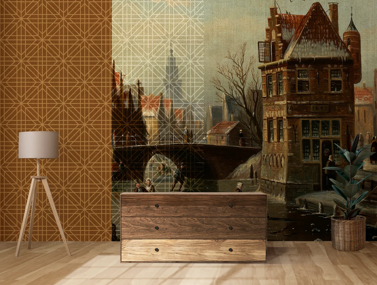 A premium wall mural combining geometric pattern with vintage city painting, perfect for luxury feature walls and designer interiors.