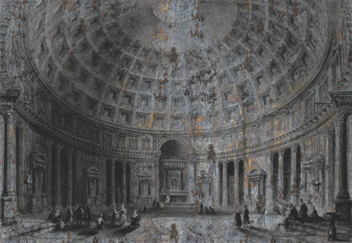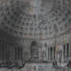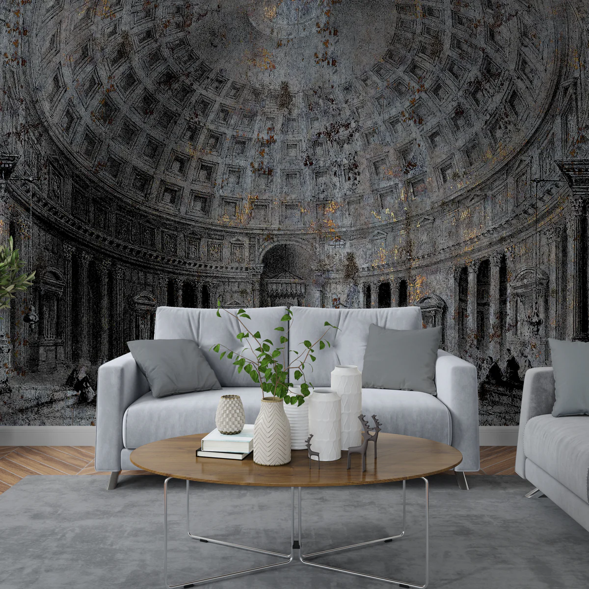 This wall mural features a grand vintage architectural design inspired by classic Roman and European dome structures. The mural shows a detailed interior with large pillars, arches, and a beautiful circular dome ceiling, creating a powerful and royal atmosphere on the wall. The antique grey texture with distressed effect adds a historic and artistic look, making the wall feel like part of an old palace or monument.