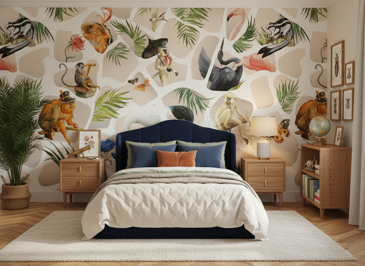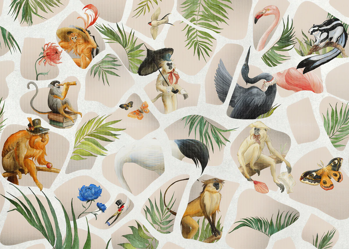 The Vintage Jungle Story Wall Mural is not a typical kids wallpaper—this is a designer, artistic concept featuring a mix of animals, birds, and botanical elements arranged in a collage style.
